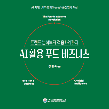 스마트산업연구소에서는 최신기술을 활용한 서적을 출판하고 있다. <“식품산업의 신혁명 푸드테크” 2024, 1 발간 > 식품의 세계는 푸드테크라는 엄청난 변혁의 한가운데에 있다. 세계 각국은 식품의 모든 면에 최첨단 기술을 활용하는 커다란 변화와 혁신이 푸드테크로 향해가고 있다. 한국푸드테크협의회에 따르면 푸드테크 국내시장 규모는 600조원, 세계 시장 규모는 반도체 산업보다 약 50여배 많은 4경원에 달하는 등 미래 성장 잠재력이 매우 큰 산업으로 전망하고 있다. <인공지능(AI)과 ChatGPT > 스마트산업연구소에서는 2024. 12 출간 예정으로 준비중에 있다.