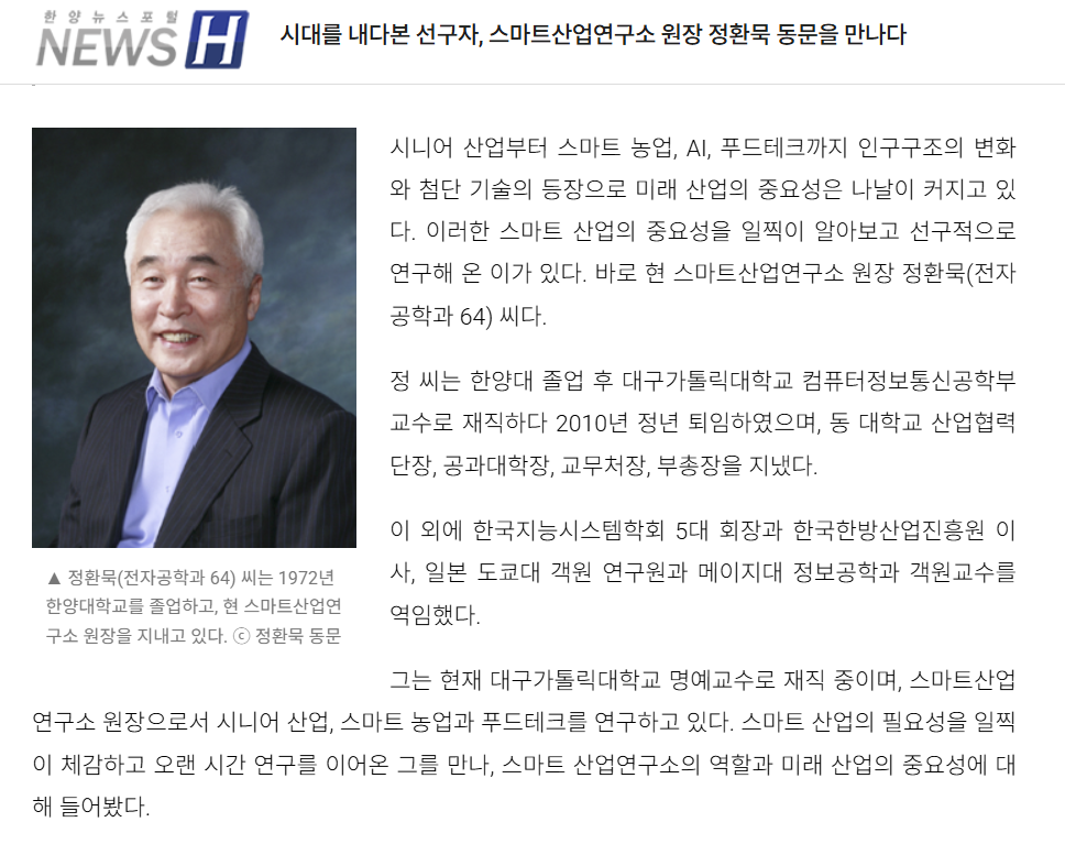4차 산업혁명과 초고령화 시대가 겹쳐가는 지금, 미래 산업의 해답을 미리 탐구해 온 인물이 있다. 바로 스마트산업연구소의 정환묵 원장(대구가톨릭대 명예교수)이다.